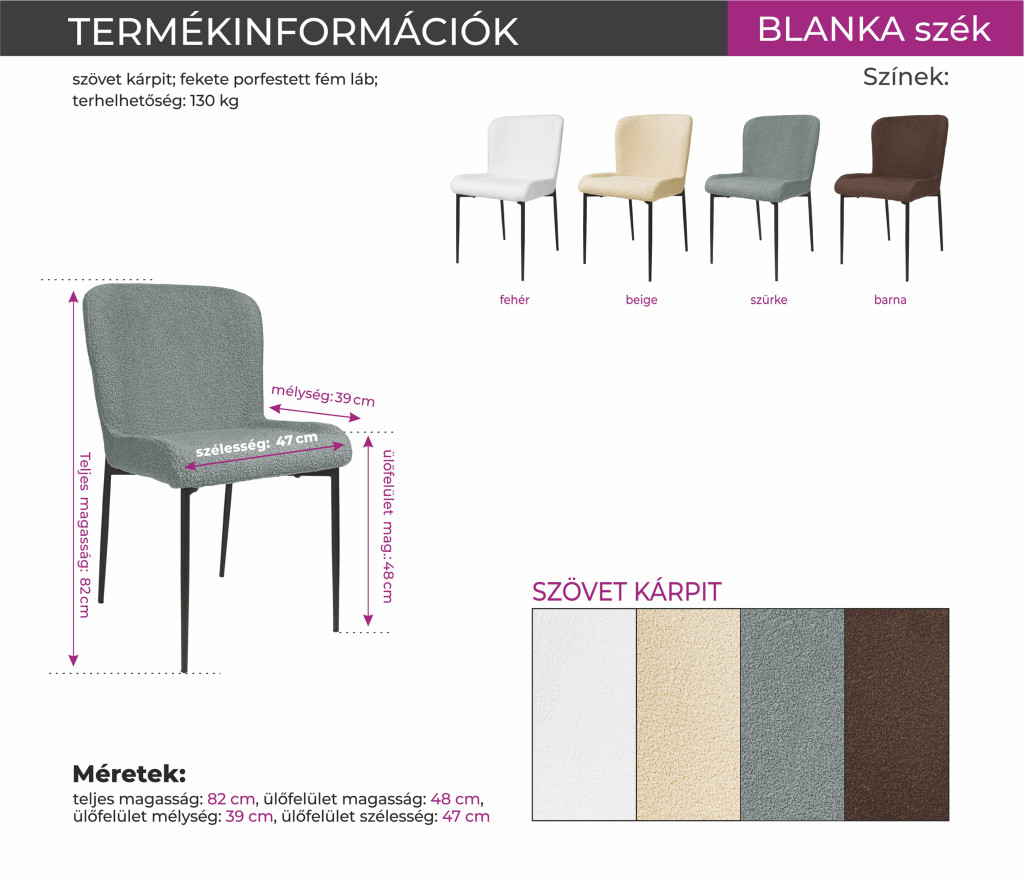 A Blanka szék méretei – 47 cm szélesség, 39 cm ülőlap-mélység, 48 cm ülésmagasság és 82 cm teljes magasság – ideális arányokat kínálnak a kényelmes étkezéshez vagy munkához. A kompakt kialakítás miatt kisebb konyhákba, étkezőkbe vagy irodákba is könnyen beilleszthető.