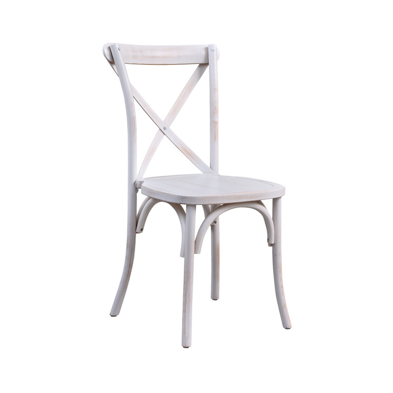 A CROSS BACK fa esküvői szék antikolt fehér színben a romantikus és elegáns hangulatot kereső párok és dekoratőrök kedvence. Klasszikus, mégis modern stílusjegyeket hordoz, így bármilyen ünnepi helyszínt képes egyedivé varázsolni. A tömörfa szerkezet garantálja a tartósságot és a stabilitást, míg a finom csiszolás és az aprólékos kidolgozás kiemeli a szék esztétikai értékét.