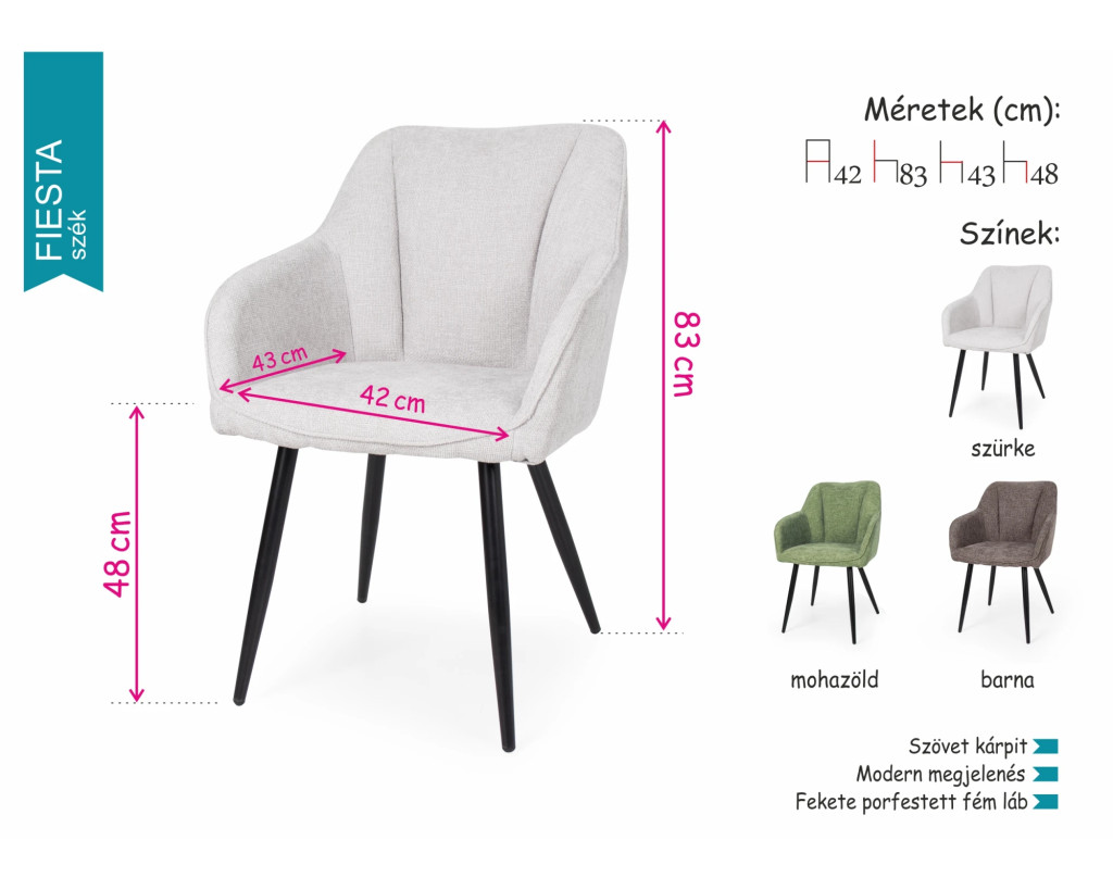 A Fiesta szék kényelmes ülése és ergonomikus formája minden étkezéshez és társasági eseményhez ideálissá teszi. A puha, de erős szövet kárpitozás biztosítja a tartósságot, miközben kellemes tapintású felületet kínál a használónak. Az ülőlap szélessége 42 cm, mélysége 43 cm, magassága pedig 48 cm, ami optimális kényelmet biztosít hosszú étkezések során is. A teljes magasság 83 cm, ami ideálissá teszi a legtöbb étkezőasztalhoz.