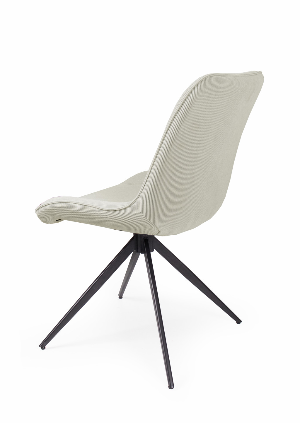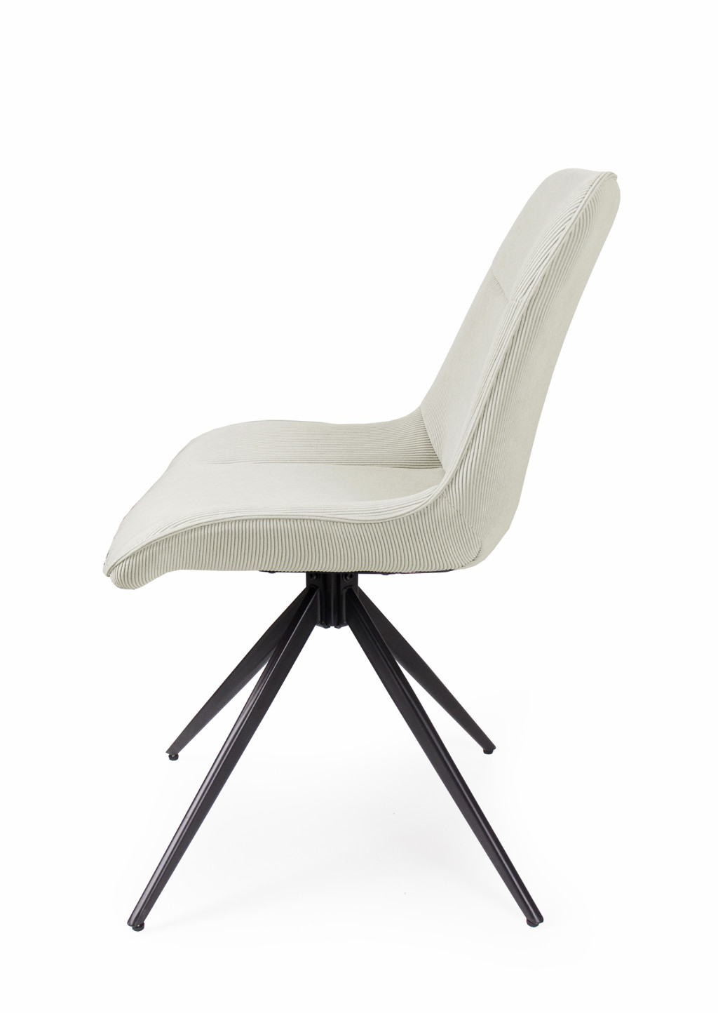 A fekete porfestett fém lábak stabil, mégis letisztult megjelenést kölcsönöznek a széknek. A kordbársony kárpit finom textúrája prémium érzetet nyújt, a precíz varrások és a komfortos párnázat pedig gondoskodnak a hosszú távú kényelemről.