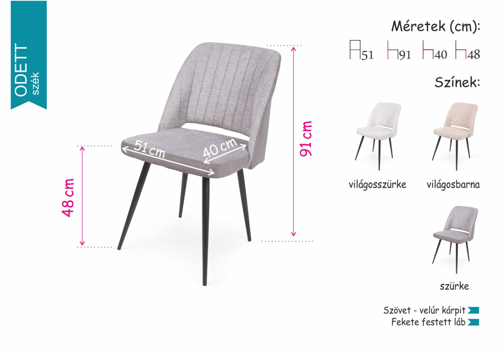 Az Odett szék három elegáns árnyalatban – világosszürke, világosbarna és szürke – érhető el, így könnyen megtalálható az adott helyiség színvilágához illeszkedő változat. Tökéletes választás lehet modern konyhákba, étkezőkbe vagy akár irodai terekbe is, ahol fontos a funkcionalitás mellett az esztétikum.