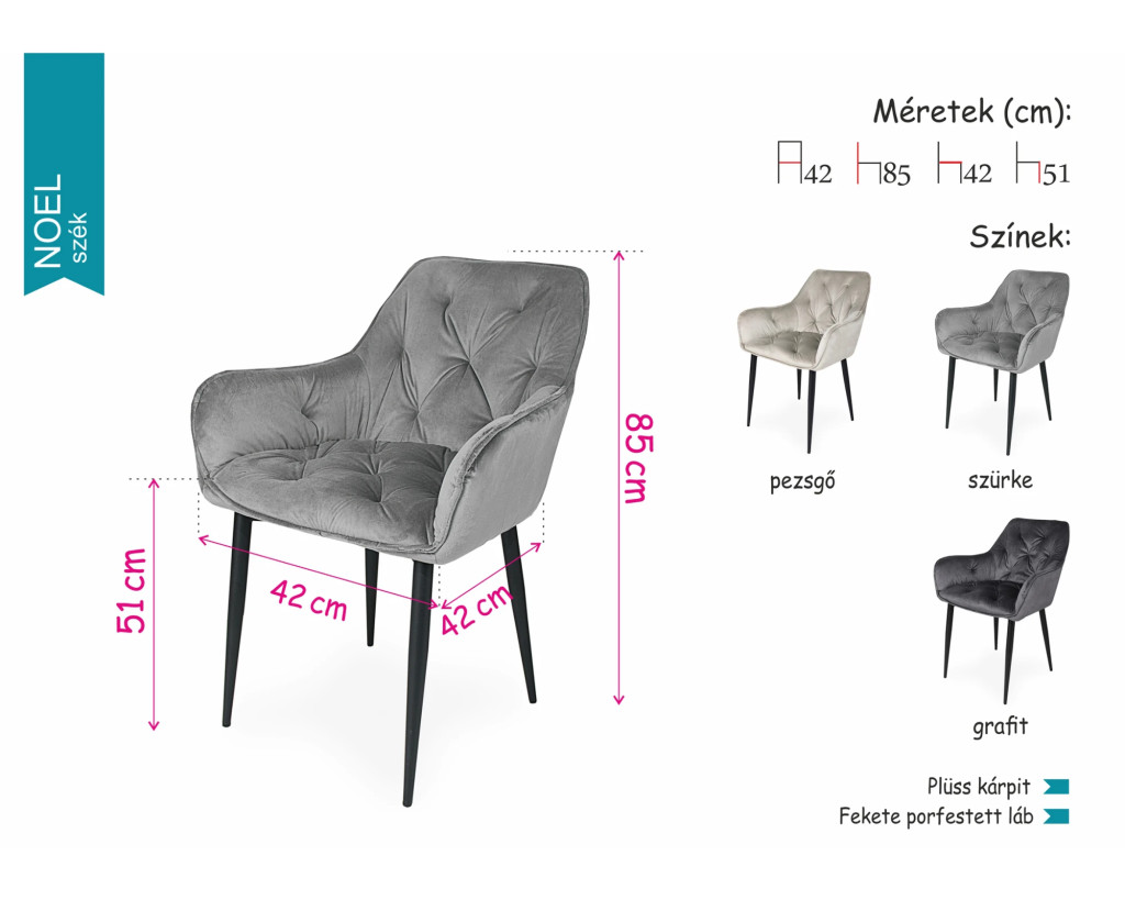 A szék három letisztult, harmonikus színváltozatban érhető el: pezsgő, szürke és grafit. Ez a színpaletta lehetővé teszi, hogy a Noel szék könnyedén illeszkedjen különböző lakberendezési stílusokhoz – a skandináv, minimalista vagy akár ipari enteriőrökhöz is. A 42x42 cm-es ülőfelület méretek, valamint az 51 cm-es ülőmagasság optimális üléspozíciót biztosítanak, míg a 85 cm-es teljes magasság kiegyensúlyozott arányokat kínál.